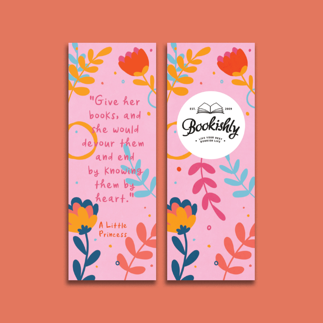 A pink bookmark featuring a beautiful floral pattern and a quote from Frances Hodgson’s Burnett’s A Little Princess that any book lover will relate to. Perfect for readers!