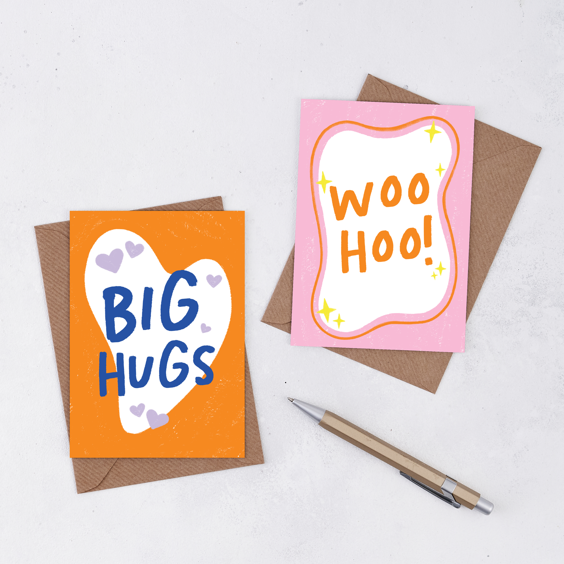 Introducing our bright and bold greetings card collection, perfect for brightening up displays. This 'Big Hugs' greetings card features a white heart on a bold orange background with a blue handwritten font and purple hearts. Great for a new couple having a baby. Great displayed in bookshops and gift stores.