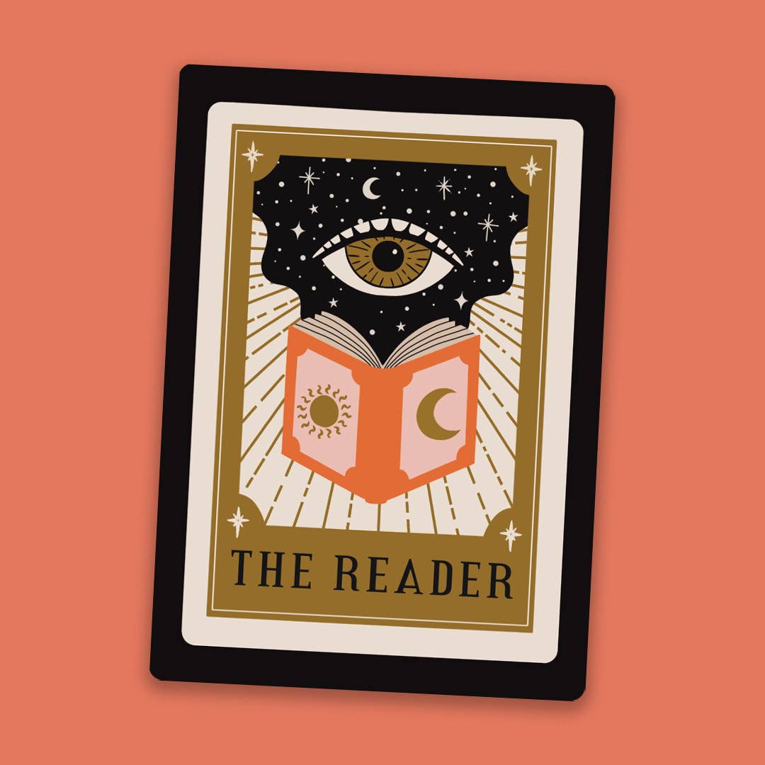A large die cut vinyl Halloween sticker inspired by Tarot cards. 'The Reader' features an all-seeing eye hovering over an open book adorned with sun and moon symbols, set against a starry, cosmic backdrop.