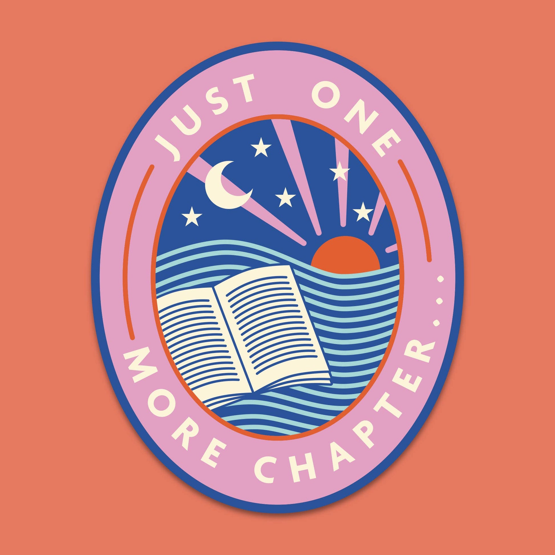 A large die cut vinyl sticker featuring bookish quotes "Just one more chapter."