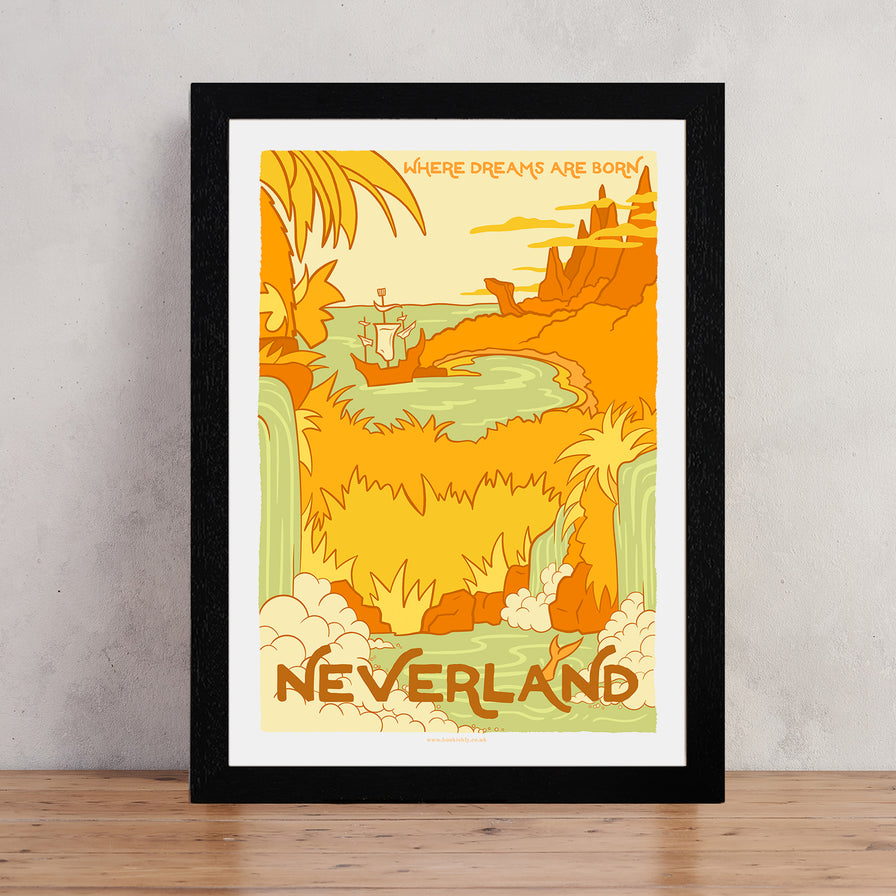 A fun vintage style travel poster featuring the iconic fictional location, Neverland.