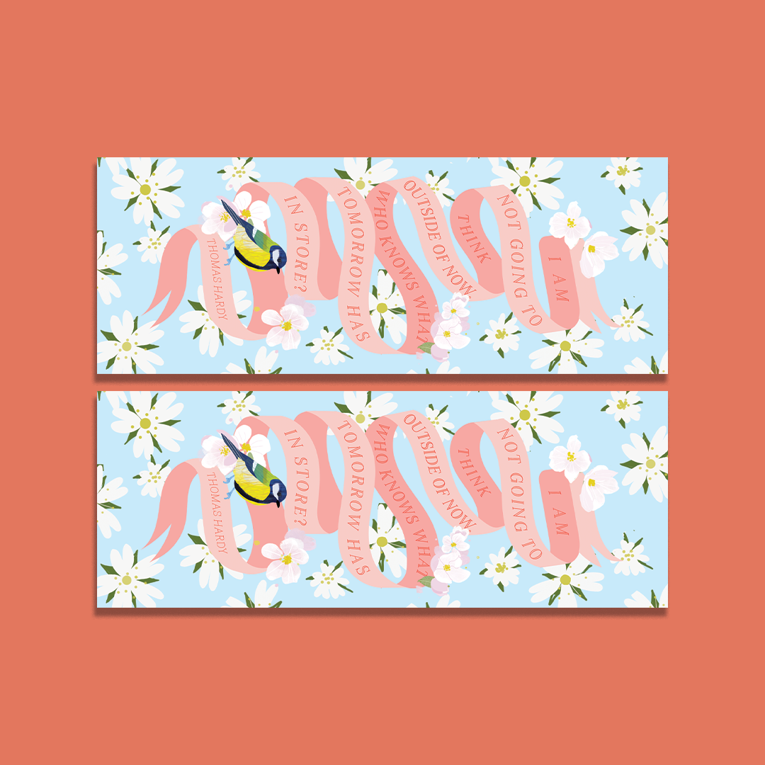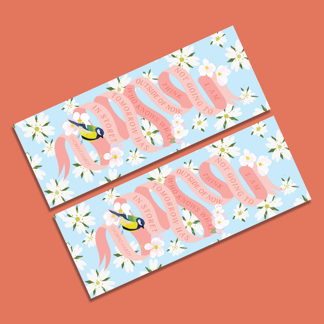 A beautiful bookmark featuring a bright floral design and a quote from Thomas Hardy's Tess of the d'Urbervilles.