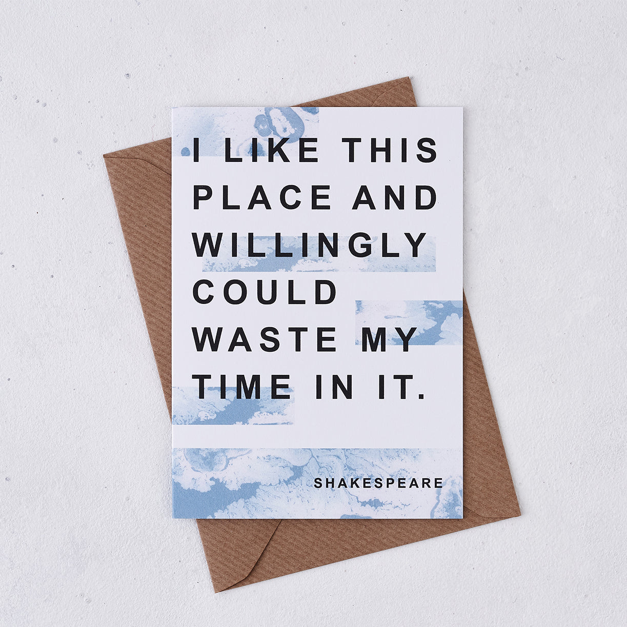 This lovely, literary greeting card features a quote from William Shakespeare in a bold, eye catching text over a beautiful blue marble effect.