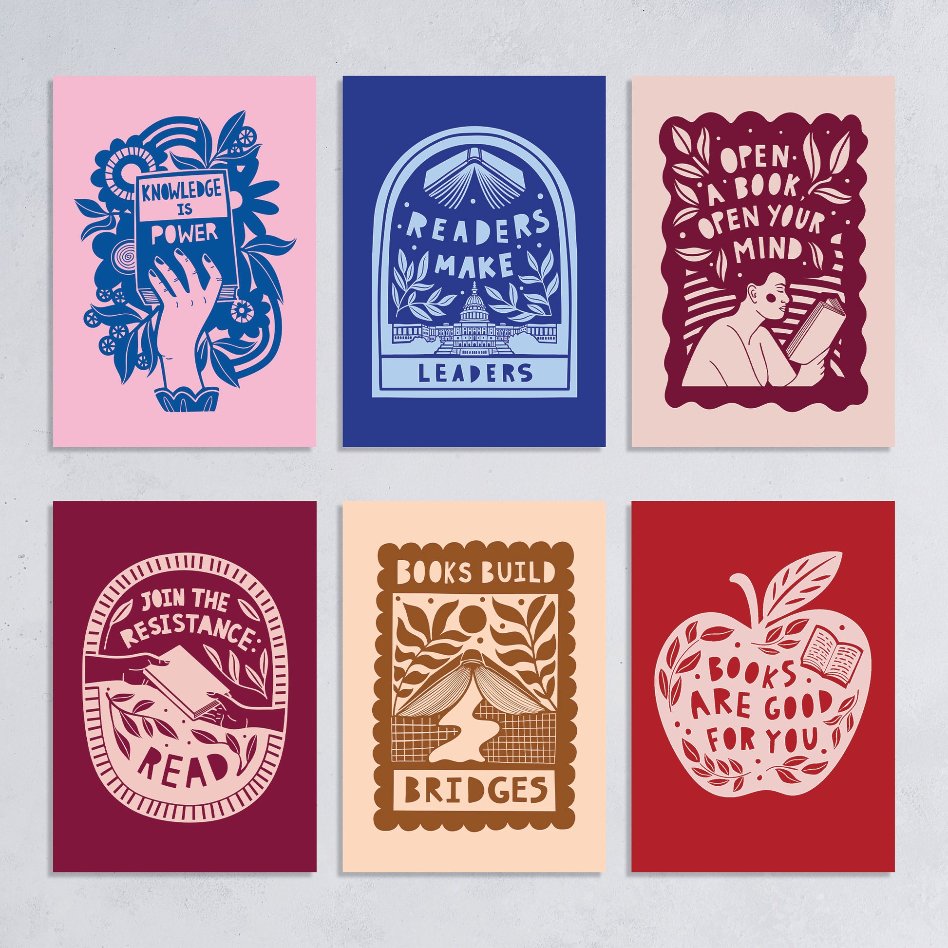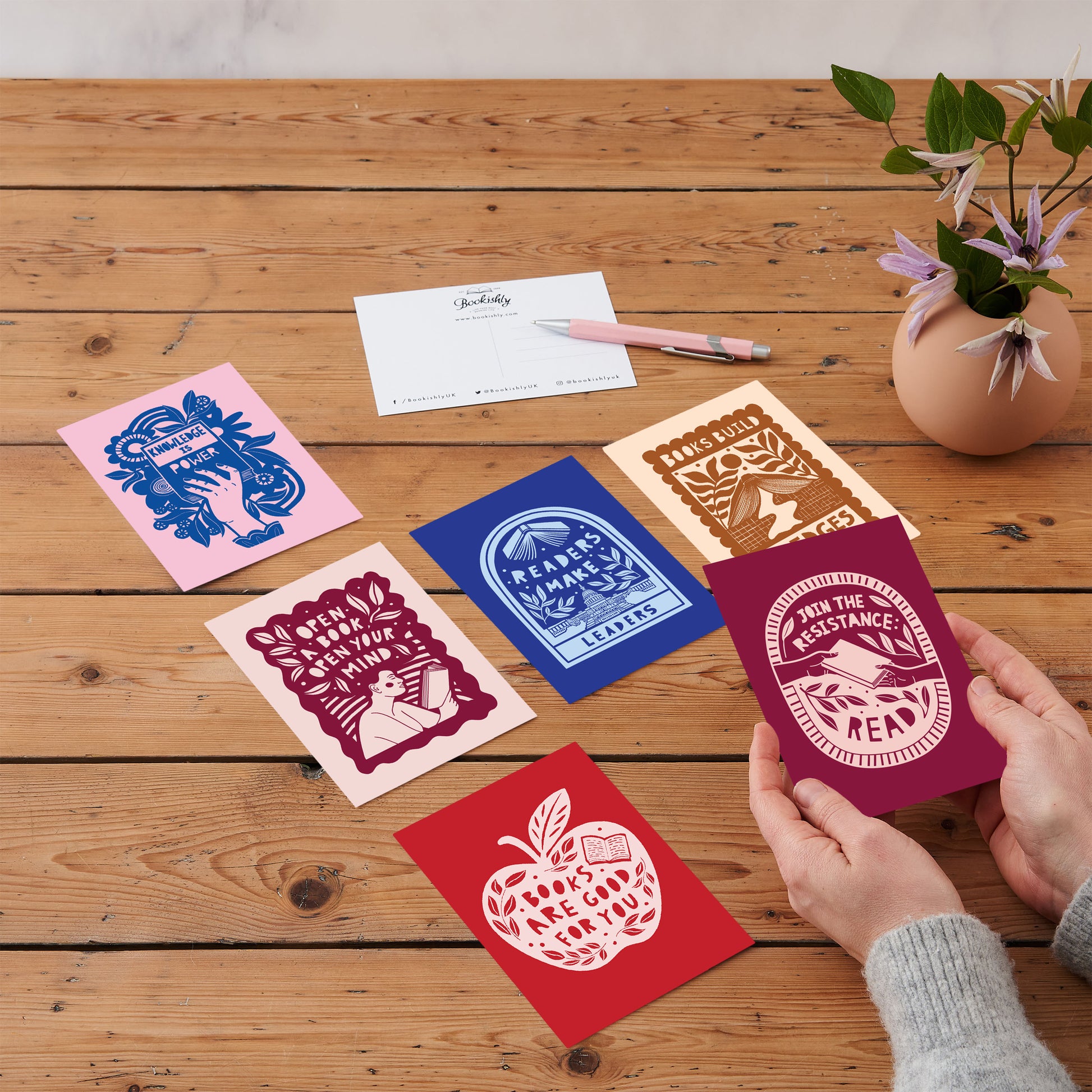 Hand drawn illustrations printed onto high quality 300gsm smooth textured card. Perfect for book lovers, bookworms, bibliophiles, bookshops. Two packs of 6 in each set.