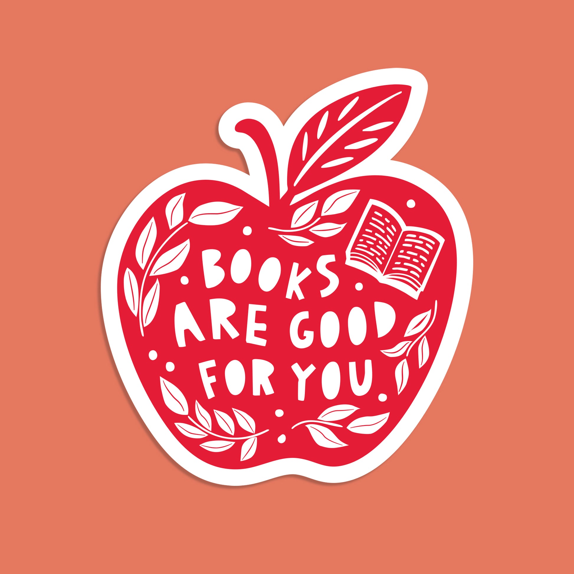 A die cut vinyl sticker featuring bookish quote 'Books are good for you' in a red apple hand-illustrated design.