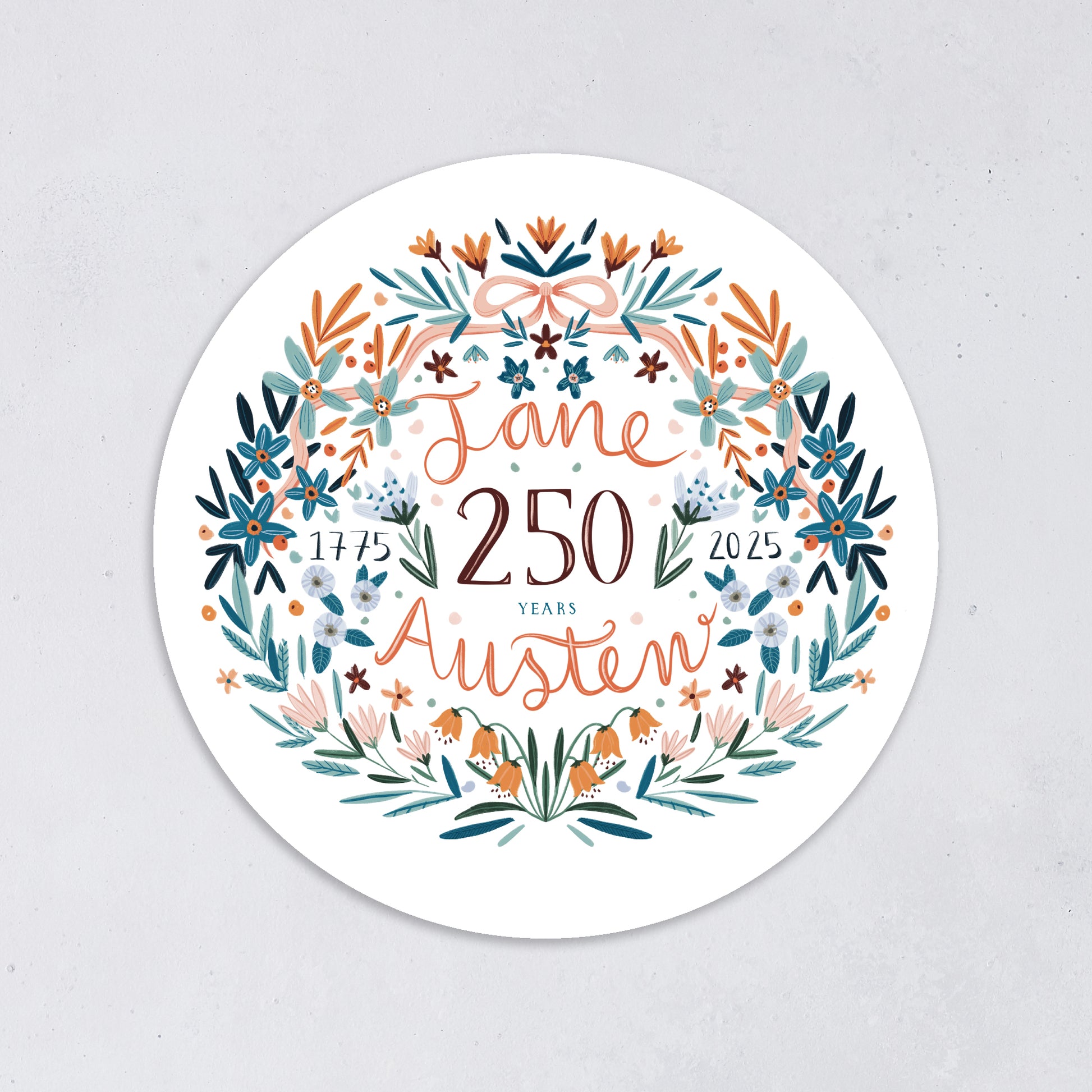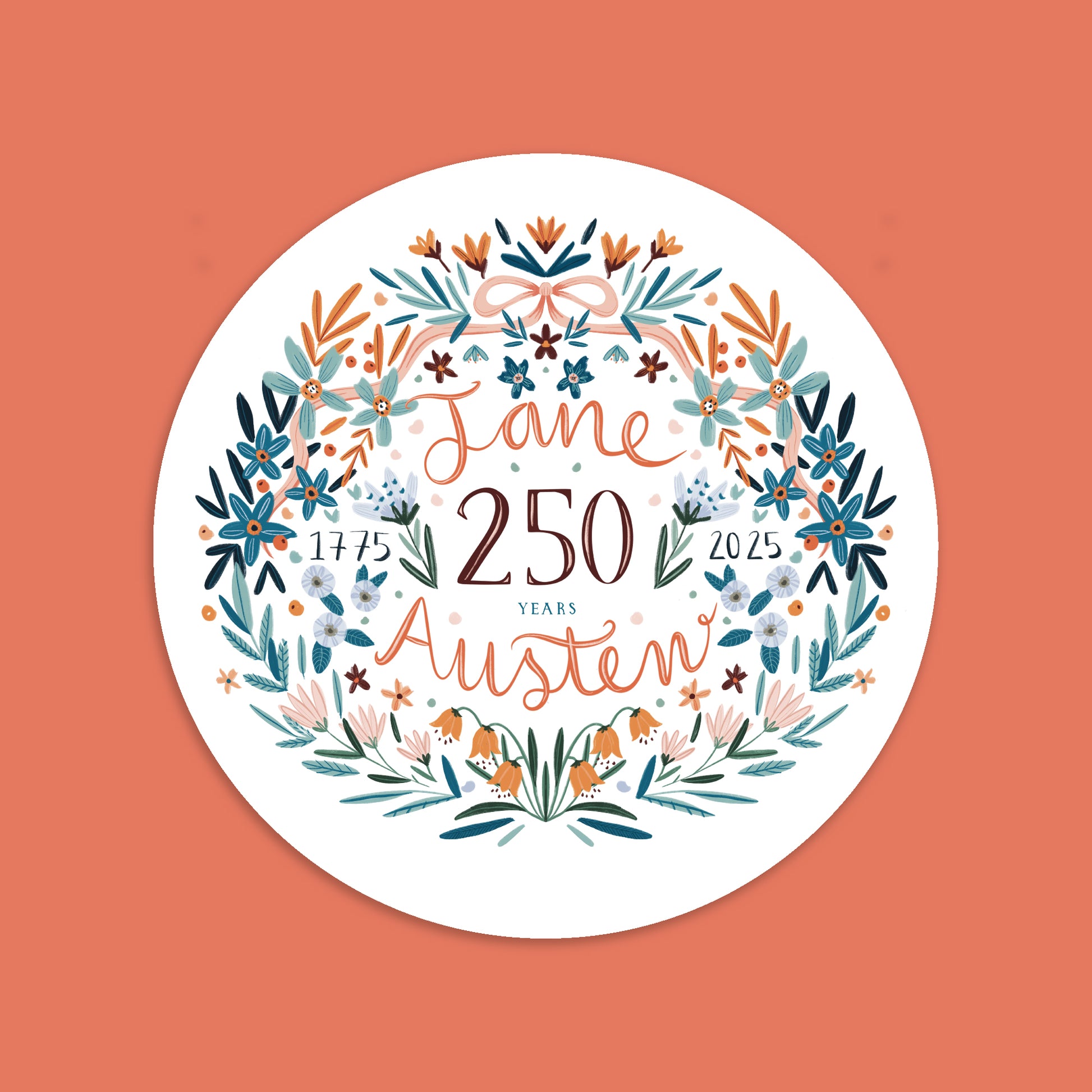 Raise a toast to one of the most beloved authors of all time with this stunning Jane Austen 250th Anniversary large die cut vinyl sticker! Commemorating 250 years since Jane Austen's birth in 1775, this elegant design features a delicate floral wreath surrounding her name and the anniversary dates, "1775–2025."