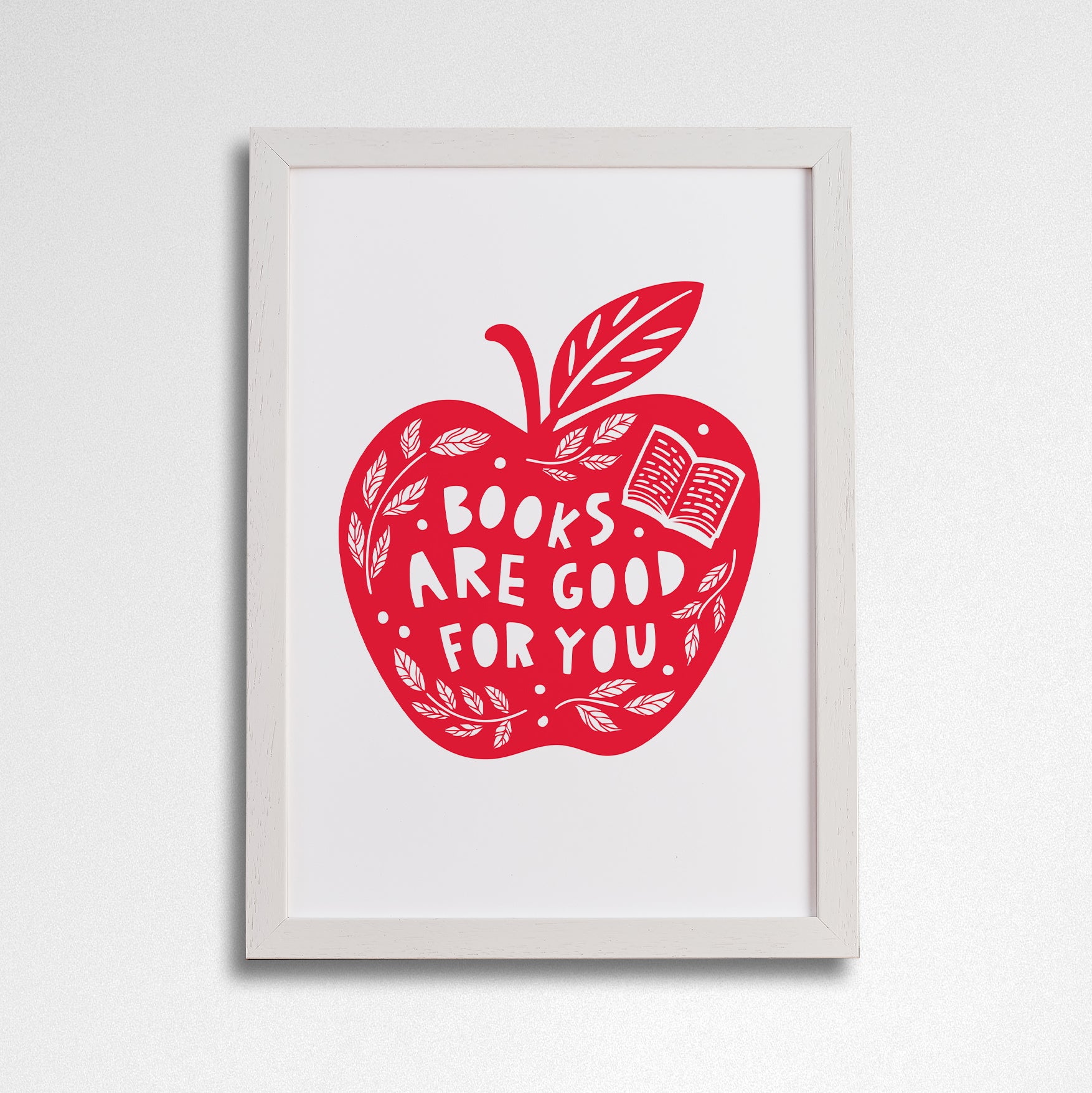 A4 print 'Books are good for you' in a red hand-illustrated apple design.