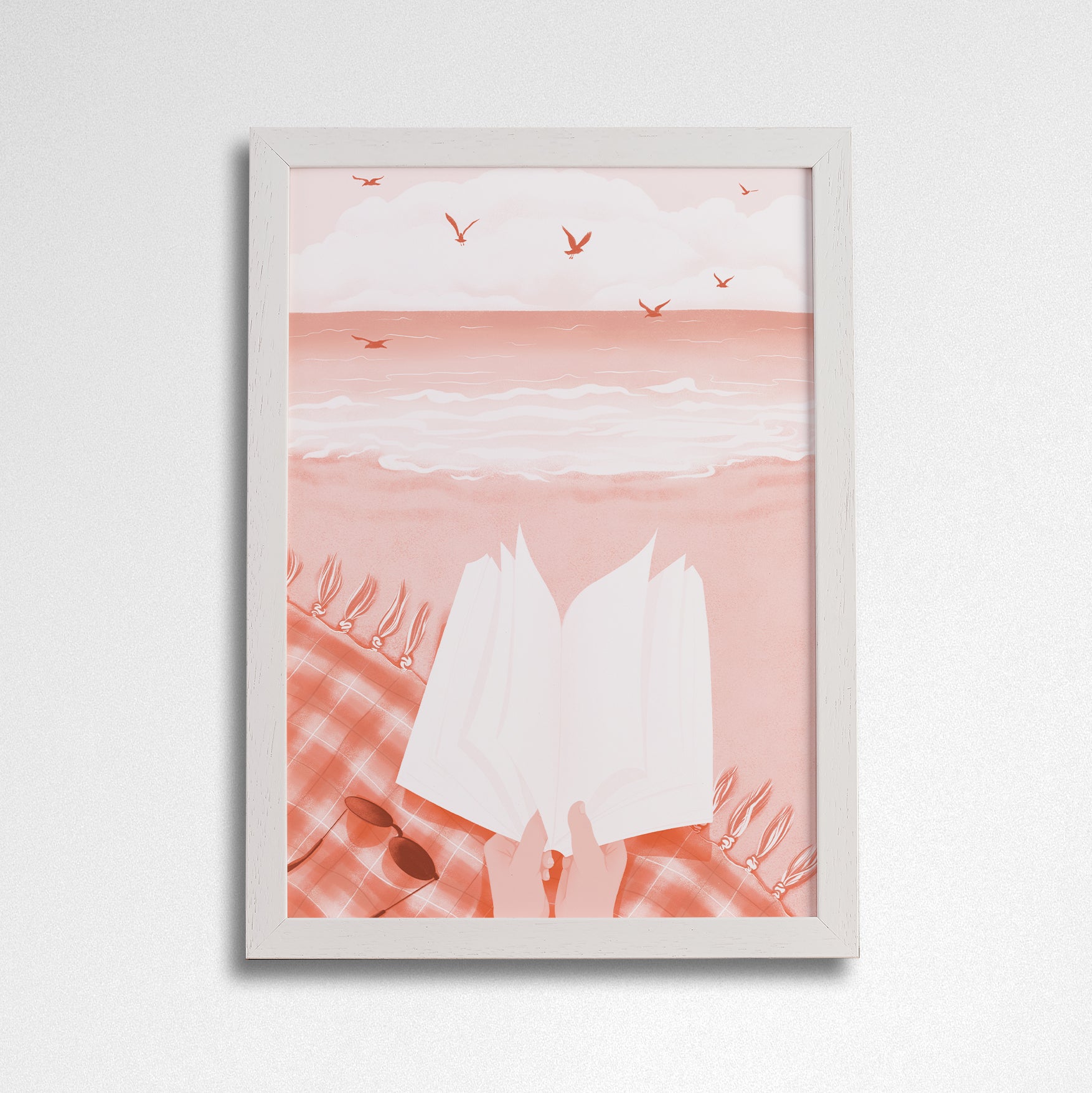 A bookish POV print of someone reading by the seaside, with a muted colour palette.