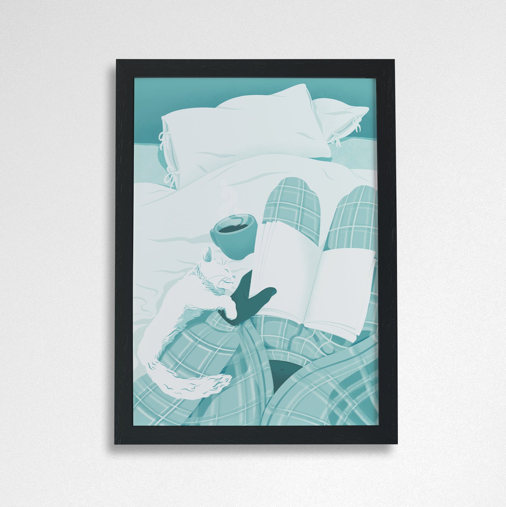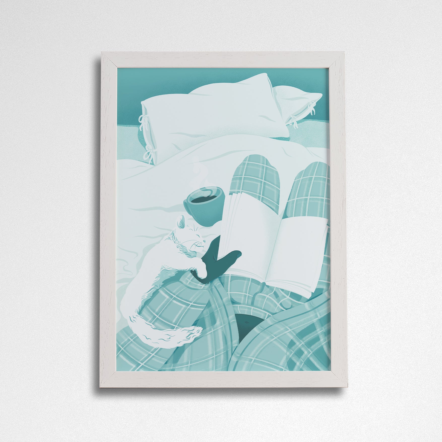 A bookish POV print of someone reading cosy in bed with a cuddly cat and hot drink. Muted colour palette.