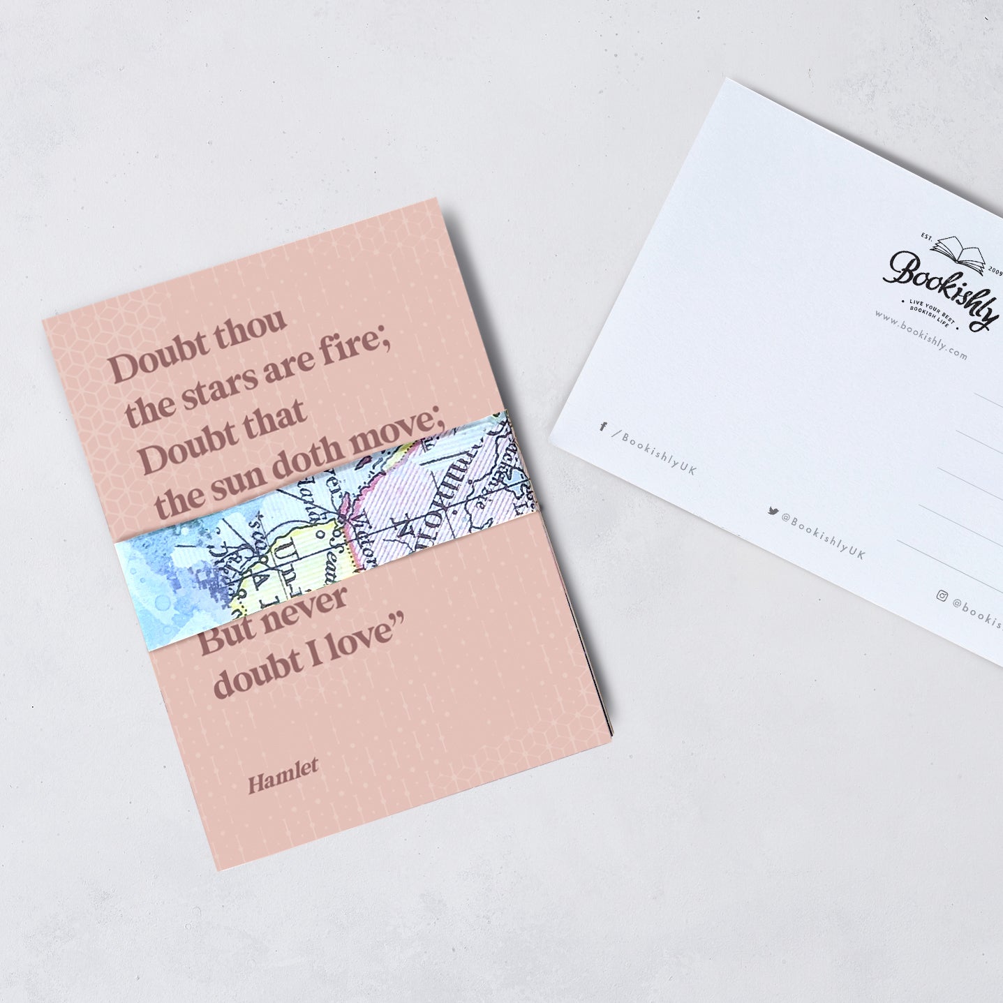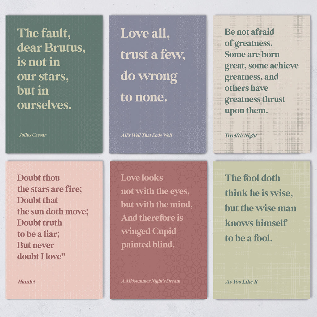 Each set has twelve postcards featuring six unique designs with a Shakespeare quote. There's two of each design in a set.